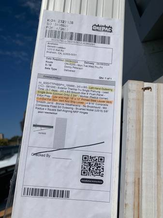 New fiberglass Prehung door 3’ x 8’ ,4 9/16 composite jambs therma-tru full light Smooth fiberglass Outswing Doors with vents . With white weather strip , black threshold, and hinges. And 2 vents 18”x 12” primed steel