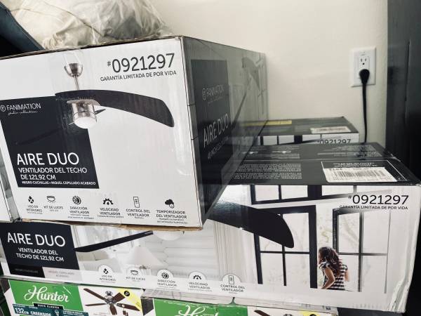 Brand new in the box, not used, not open box , no damage. Come from Lowe’s Have remote control.