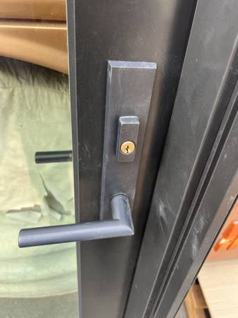 Marvin door company, full light display door,with three point locking mechanism , ball bearing hinges tempered insulated low E glass. In swing black clad exterior, Black finish wood interior. including the nailing fin for new construction, with key and 3 point lock hardware , complete including threshold and weatherstripping, Unit size 43 1/2” x 95” 1/2” 4 9/16” jambs.