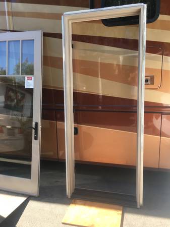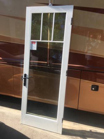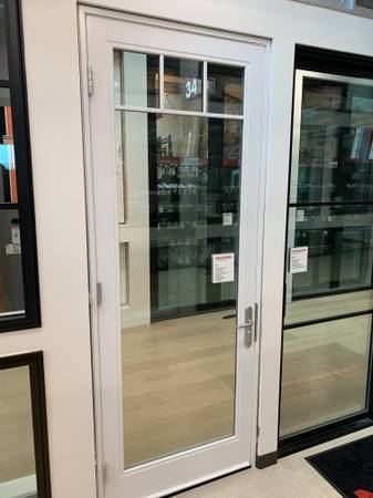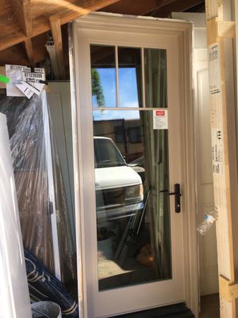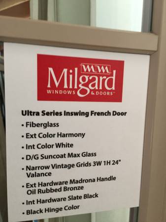 Milgard in Swing ultra series Fiberglass French door unit. white inside Harmony outside color , Multi point lock , adjustable hinges . Tempered insulated Sun coat max argon filled glass ,Unit size 35 1/2” x 89 1/2” with inside color black multi point lock hardware and key, outside hardware color oil rubbed bronze. for 4 9/16” jambs with aluminum "stucco key ", grids