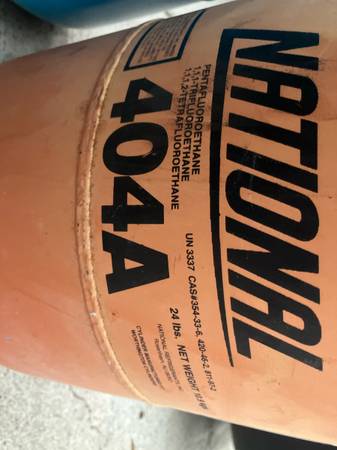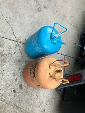 One blue one orange tank full. These were purchased from an estate sale. If you can use them send me a text. Thank you. Are 12, R1 34 a, R 500, replacement 404 a orange tank.