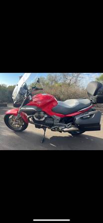 2007 Moto Guzzi Breva 1100 with 27k miles, good tires, bags, windshield, new battery. If you like an upright riding position on an Italian bike with ample passing power and the ability to bring home groceries, this might be the bike for you.