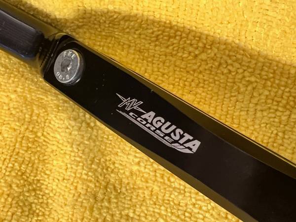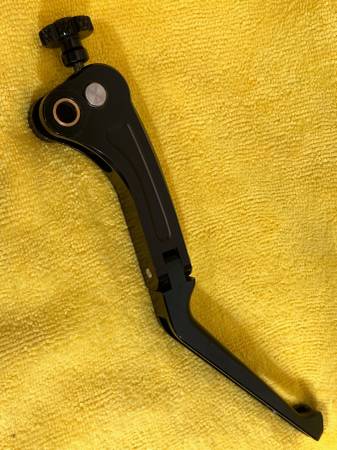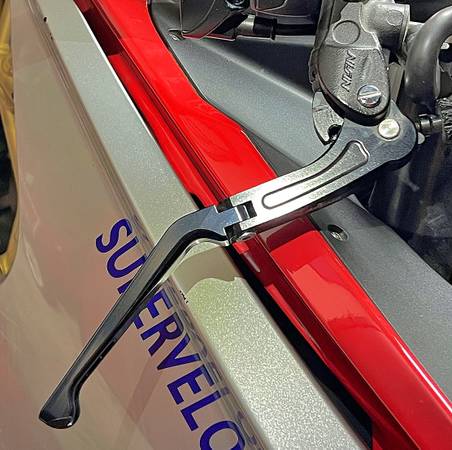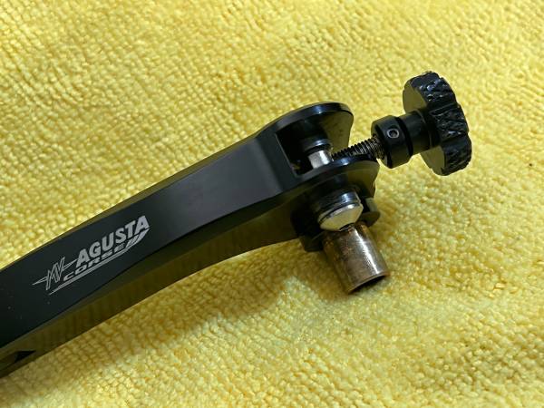 MV Agusta Special Parts Brake Lever. Articulated, folding lever with etched MV logo from MV’s accessory parts catalog. As seen in the photos, it has light road rash on the end. The on-bike photo shows how it doesn’t stand out on the bike after being touched up. The price is firm.