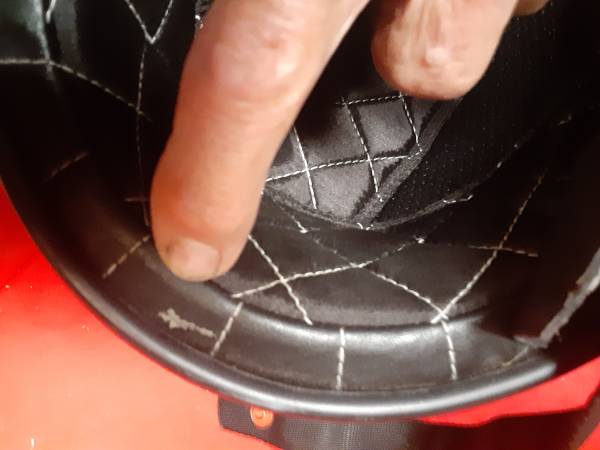 Shows normal wear on the outside scratches, the inside padding shows some flaking off as shown.
