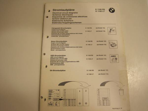 OEM BMW Motorcycle Electrical Circuit Diagrams for 1993 K1100RS and K1100LT models. This manual contains all of the circuit diagrams for: - Frame - Engine - ABS - Optional Extras If you see this ad,...