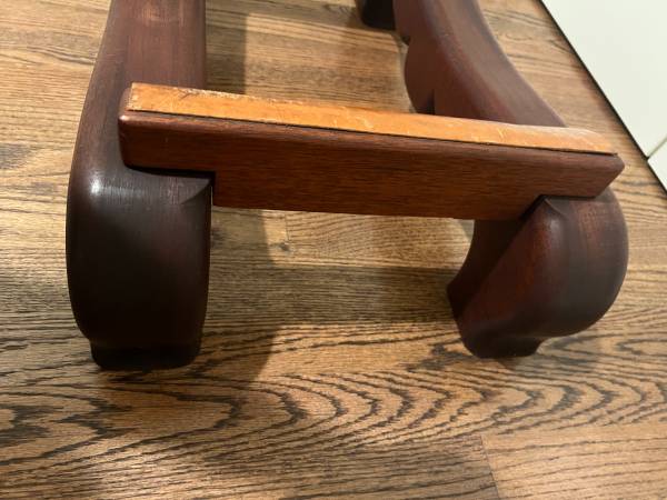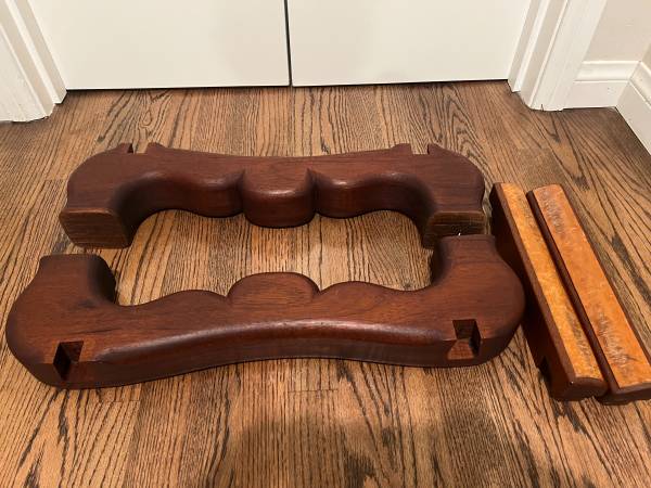 Custom dark wood double bass stand in very good condition. Clever modular design with natural cork side rails to protect your bass finish. A great way to show-off your prized bass.