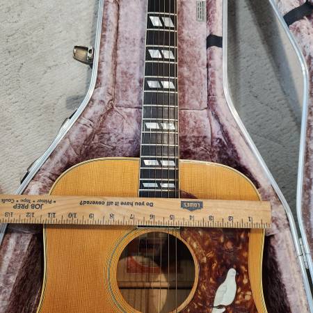 Fits dreadnaught size acoustics or smaller. I took a few photos with the dreadnought size Gibson and then with a smaller 000-sized Martin just so you could get some perspective.