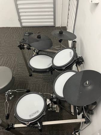 Simmons electronic drum set bought new from guitar center . It has not been used much. All pads are in good functioning condition. One of the cymbals stand holders is cracked, but can easily replaced or repaired. This package includes a drum throne and a bass pedal. This is a quality set for a discount price.