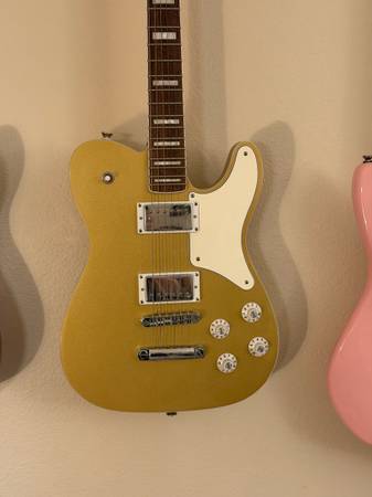 Essentially brand new. Plastic still on the rear cavity cover. A Les Paul in a telecaster body, hence the “Trouble Maker” name. Aztec Gold.