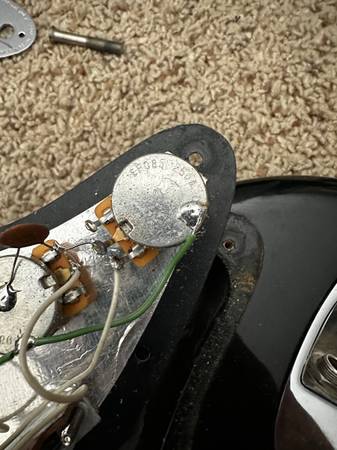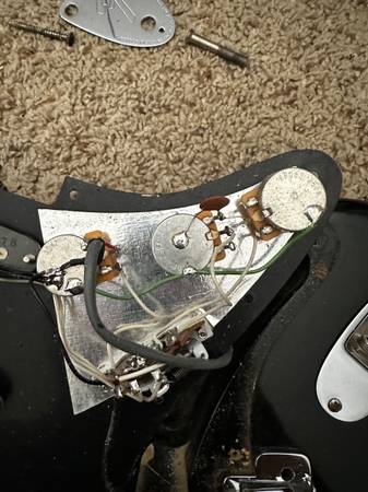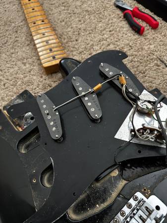 Original grey bottom pickups, original tuners, and original case. All original finish on both the neck and body. Original trem and springs. Original nut. Newer trem arm and pots as the old ones were getting a little scratchy. Plays just lovely, and I'm sad to see it go. But, just have too many and I'd love to see someone play this thing for another 45 years.