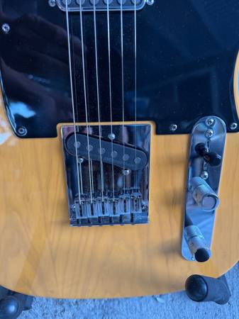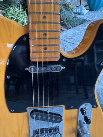 2008 Fender American Deluxe Ash Telecaster Butterscotch Blond with TV Jones Starwood Pickups. This guitar came stock with noiseless pickups and S-1 switching but the pickups and S-1 switching have been removed. Everything else is stock. Modern chromed stainless steel bridge, Chromed brass plated saddles, ash body is finished in classic butterscotch blonde, with a stock ‘52 Telecaster U-shaped 22 fret maple neck and fingerboard adorned with abalone dot position inlays. Weighs 7.4 lbs on my postal scale. Upgraded Fender G&G classic tweed case included. Price is firm, no trades or offers.