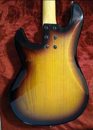Slightly smaller body which is poplar sandwiched between front and back sections of ash. Wood grain is beautiful under a sunburst finish.