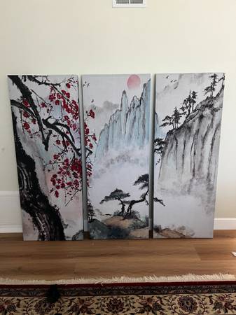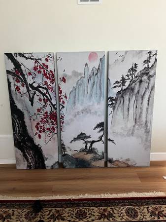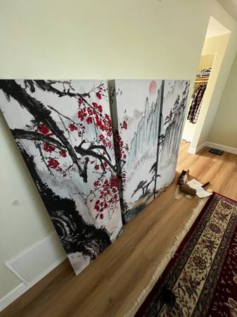 A set of 3 brand new japanese wall art Acoustic Panels. All 3 are upholstered with a tapestry art fabric and contain rockwool safe n sound insulation. Size is 2' x 5 ' x 2.5 inch thick