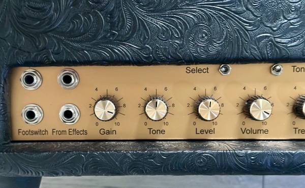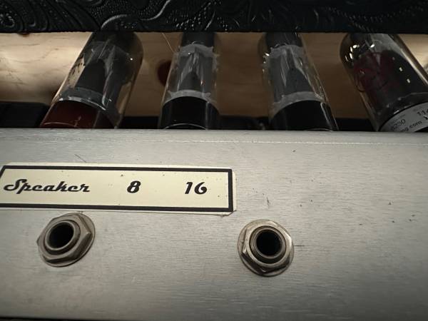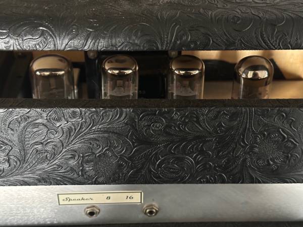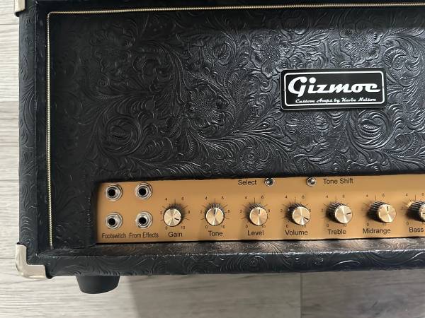 Gizmoe The Medicine Man Boutique Tube Amp built by Kevin Nelson. Has a switch to go between Marshall Plexi tone and Fender Bassman tone. Also has built in overdrive and effects loop. Has 4 EL34 power tubes and 2 12AX7 preamp tubes. Rated at 100 watts. Sounds amazing!