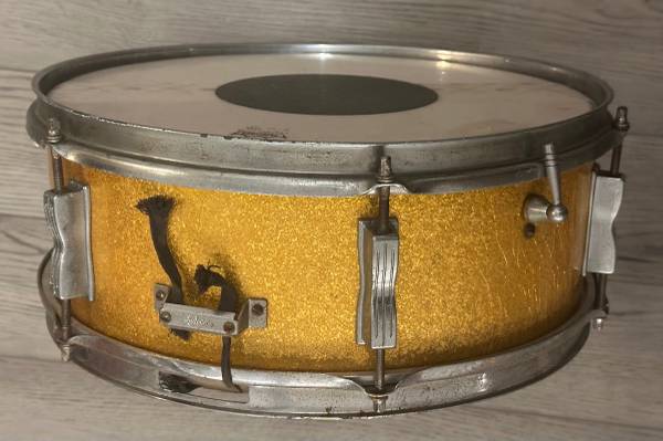 Ludwig 1960’s Gold Sparkle No. 491 Pioneer 5x14" 6-Lug Snare Drum, Keystone Badge. Needs cleaning up. Text me to see it