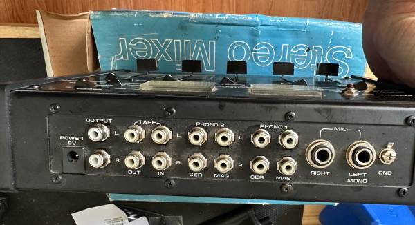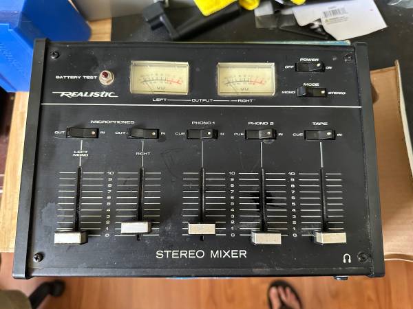 This is a Realistic battery powered mixing board. It has been sitting for a long time. I checked all of the channels work, but it may need some electronic cleaner to get everything working...