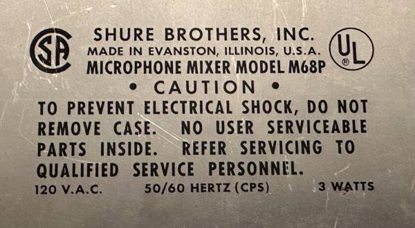SHURE BROTHERS, INC. 4 Channel Mixer M68P. MADE IN EVANSTON, ILLINOIS, U.S.A. MICROPHONE MIXER MODEL M68P