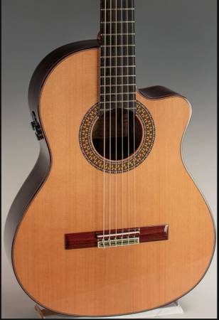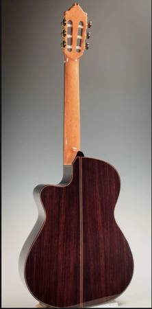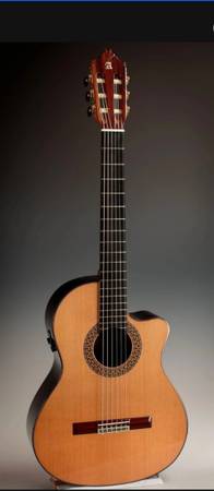 The Alhambra 9P CW E8 Classical Guitar is a handmade Spanish guitar with cutaway & electronics. It is a beautiful, all solid, concert-quality classical guitar. It is beautifully crafted, has a wonderful tone, is very loud, and is very playable. This is an excellent choice for the serious guitar player.