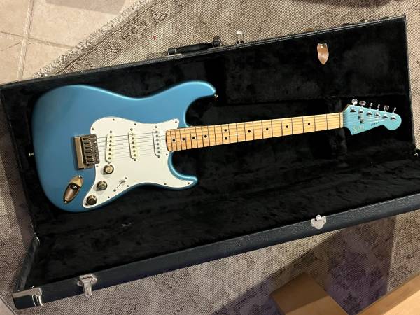 This is a USA 1980 fender vintage Stratocaster called “the Strat” and it’s in really nice condition and plays like a dream. It has not seen much playing time in its 45 years of life as it’s very clean except for a couple of little dings on the side. The bridge and knobs and neck plate are actually real gold plating on this model. The tuning keys in 1980 and 81 where regular chrome as production of them in gold were not ready yet. Interesting fun fact. The neck was headstock was made from the old tooling, before they switched over to the fat head headstock which gave it its unique appearance. Anyway, this is a killer guitar with amazing sounding original all stock electronics. The last tone knob is actually a switch for even more tones. Only made this style for 3 years I’m pretty sure. Comes with an excellent hard case. I think it’s a GandG case which fender used them.