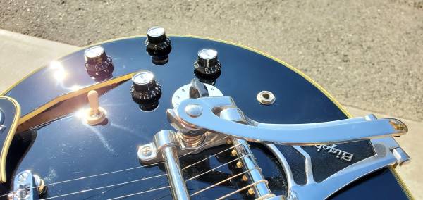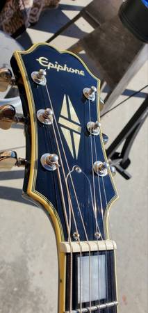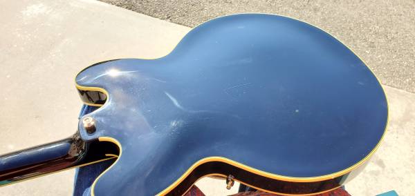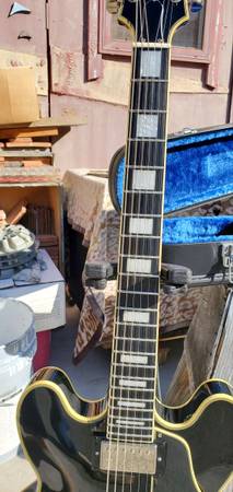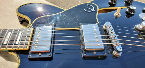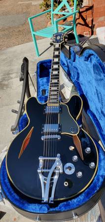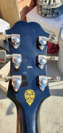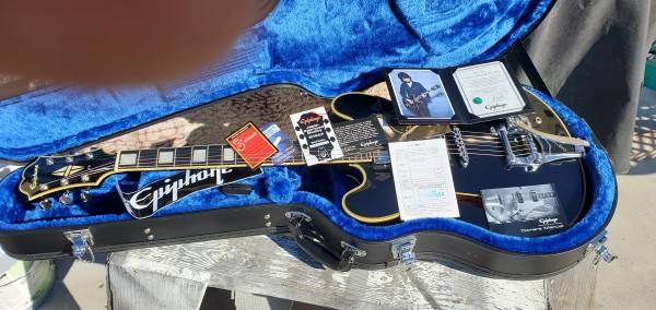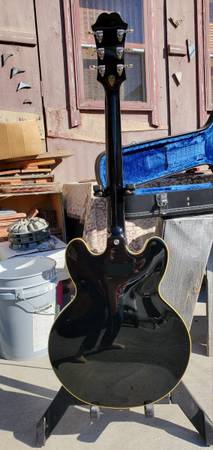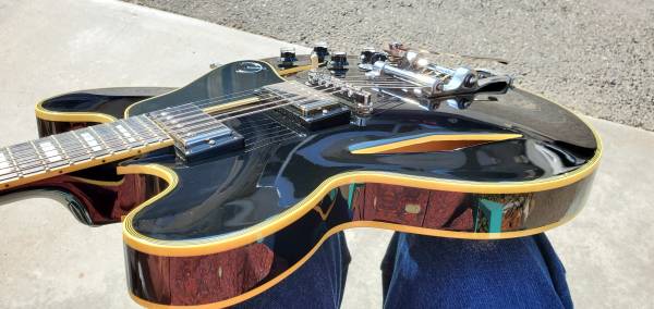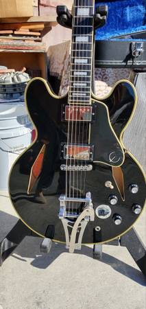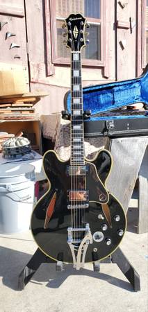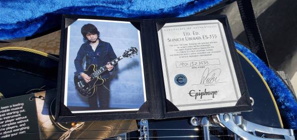 "Epiphone Shinichi Ubukata ES-355, gloss black, made in China 2019. This model was a limited release for the Japan market only, made for a year or so only. Shinichi Ubukata is the guitar player for iconic pop punk band Ellegarden, as well as his subsequent project Nothing's Carved In Stone. It's a bold aesthetic: it's based off the classic ES-355, which takes the 335 and adds some Lp Custom style 7-ply binding, block inlays and a split diamond headstock. Trini Lopez style diamond holes and a BB King Lucille style Varitone switch complete the unusual touches, it's supremely gorgeous. It boasts some high end appointments: Grover kidney bean tuners, a lux ebony board, a proper USA B7 Bigsby and a set of Gibson Classic 57 humbuckers. The 57's are clear, open, warm, rich and sparkly with a pleasant creamy growl when paired with some drive. The Varitone switch is bypassed on position one, so that position offers the usual thick, howling hifi ES tone, but the next five position run through different capacitors for different preset EQ tones, so there's all sorts of palettes there to paint with. The neck is a moderately chunky '59 style profile, which seems to make a lot of sense with the larger body and sits comfortably in the hands. This one is sure to turn a lot of heads both in the shop and on stage.!!"