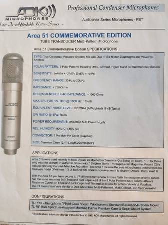 ADK Area 51 Commemorative Edition Tube Transducer Multi-Pattern Microphone. Serial number C-0004. Excellent condition. Includes power supply, 7 pin mic cable, power cable, windscreen and deluxe shock mount; all in a metal flight case.