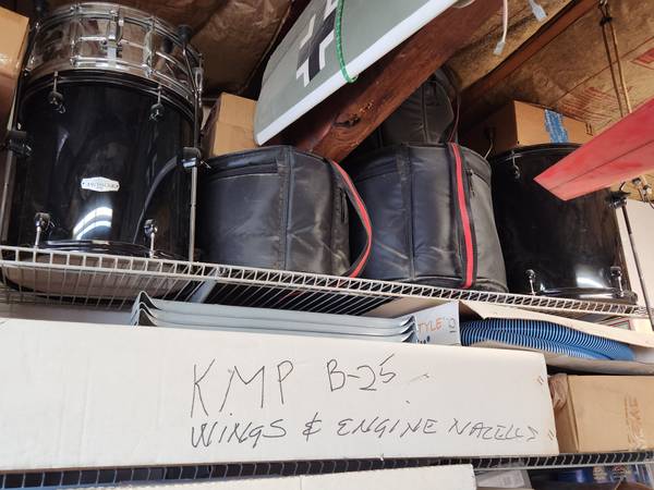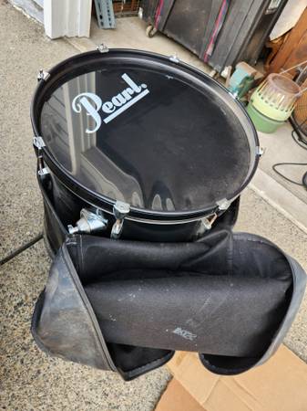 7 PC. PEARL "FORUM" DRUM SET INCLUDES, TRAP CASE WITH CASTERS 30" TALL, 16" X 26" WIDE, ADDITIONAL BAGS FOR ALL DRUMS, 4 NEW DRUM HOOPS. RARELY USED. $800. TAKES ALL