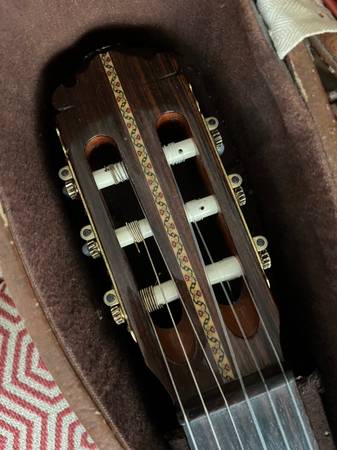 1979 Alvarez Yairi CY-125 classic guitar in good condition. Plays and sounds beautiful. Rose cedar top and Rosewood laminate back and sides. Some condition issue in the form of dings and general wear from years of playing but nothing that effects playability and sound. Comes with an old hard case in rough condition.