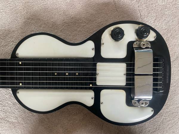 Great sounding rickenbacher Bakelite lap steel, only getting rid of it because I need to pay bills and I already have one haha. Pros: String through body, 1.5 inch pickup (essentially this is what you want, no excuses here in terms of tone). Cons: tuners aren’t in the best shape (one replaced tuner, 1 crumbling but still functional tuner button, and 3 replaced buttons, I would probably look for a 4 replacement tuners if I were to keep it but it seems stable and functions well as of now), slightly crackling tone pot although it it very functional and I personally find it a non issue, one screw by the controls is lightly stripped so I wasn’t able to open it up and see if the pots and cap are original, I would be able to get it it open if I really wanted to but I didn’t care enough to push it. There it is! Great sounding early 1940s lap steel currently set up with Scotty’s c6 strings. Oh and also I shimmed the pickup with some paper just to get it off the strings. Again, this is the model you want if you’re looking for an old Bakelite lap steel! I compared it to my other model which has the 1.25 pickup and this one has a fatter tone with more sustain. Ask if you have any questions!