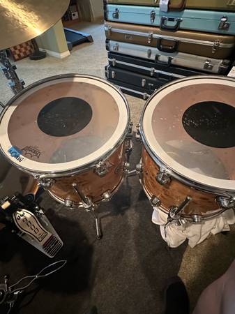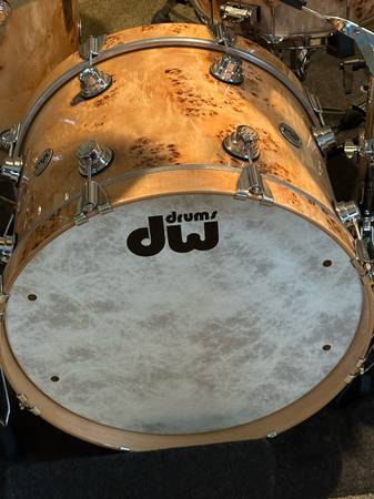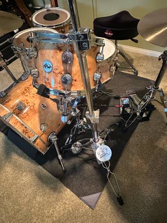 This is for a 5 piece DW exotic series Mapa burl drum set (order #970322), including DW 3000 series hardware and Zildjian A Series cymbals. The shells are 2-years old or so?? and spent most of their time in the included padded Protection Racket bags. Sizes are 20" bass drum, 12" rack tom, 2-16" floor toms w/legs, 14x6.5 matching snare. Bags are included for each of the drums, bass drum pedal and cymbals. The DW series 3000 hardware consist of 3 boom cymbal stands, 2 snare stands, 1 900 double bass drum pedal, 1 9000 high hat stand. All hardware is new in the past 1-5 months. The Zildjian A’s cymbal set (also new) has 1-21" sweet ride, 1 pr 14" new beat h/hats, 1-18" thin crash and 1-16" thin crash cymbals - all in new/mint condition. Price is pretty firm, as there is over $7800k invested and most items are NEW. Pictures of the exact hardware and cymbals u get are in The Yamaha pics posted. Buyers call or text kevin show contact info