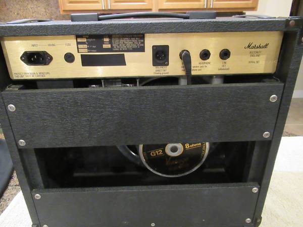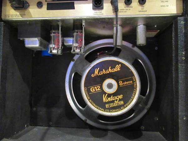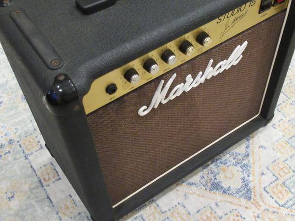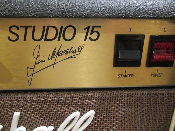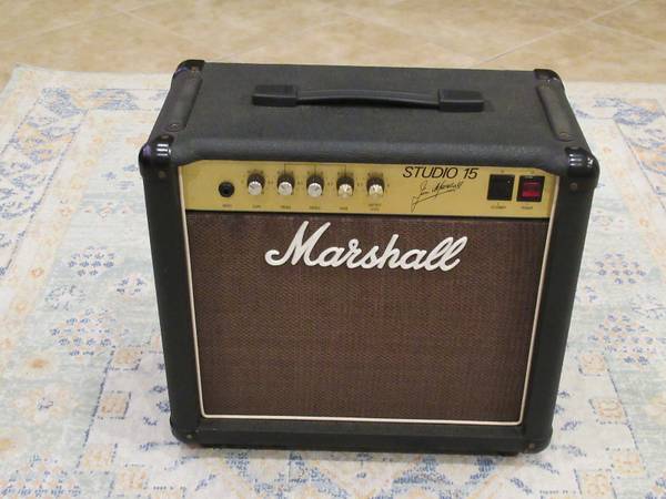This is for a 1985 Marshall Studio 15 combo amp. It's a sweet little amp with a lot of vintage Marshall tone and volume. I have included a Tuki cover along with the power cable. This amp is a 1×12” combo, 15 watts, 2x6V6, master volume, early example with brown grille cloth, Clean condition and all-stock including the factory British-made Celestion Vintage 30, a famous speaker that made its debut in this particular Marshall model. Quite an advanced feature set for the mid-1980s, too, with its XLR line out and built-in power attenuator and attendant headphone jack (on a tube amp, hardly common even today).‘80s JCM800 crunch but in small club/studio-friendly form. We don’t see these all that often, a great little amp. Made in UK. Call or text Kevin show contact info