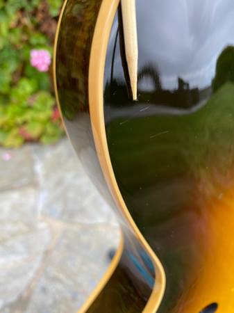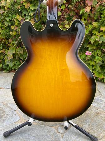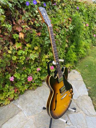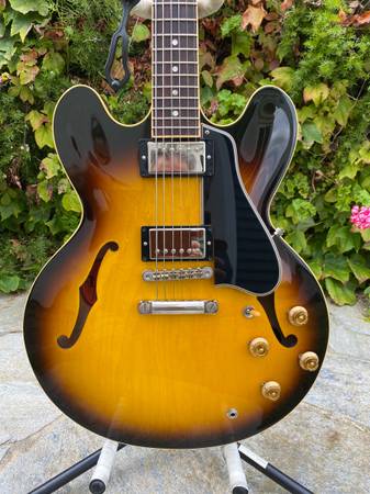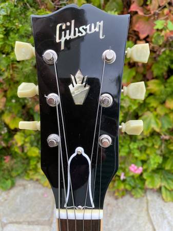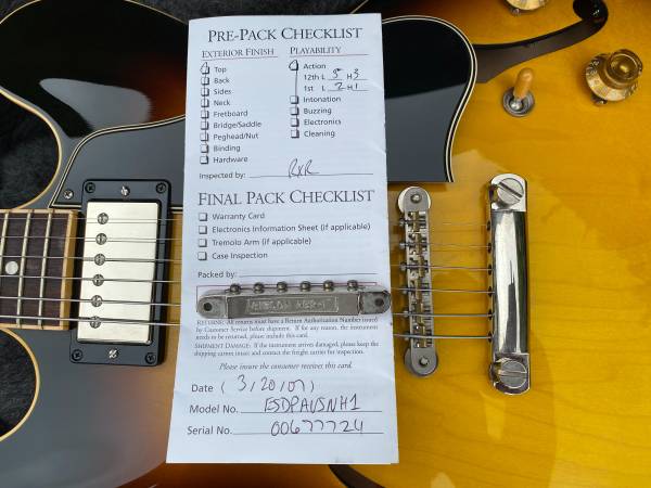 The ES-335 "Fat Neck" - while not a full-on historic reissue, this guitar is similar to the ‘59 335 reissue but with a slightly fatter '58 neck profile. Overall, the guitar is in very good condition, with no breaks or repairs, and only some minor surface scratches in the clear coat and a minor dent in the clear coat on the neck (see photos). The guitar has been upgraded with a Faber USA ABRH-ABR59 bridge with natural brass saddles and a custom 4-ply, black/cream pickguard. The guitar will come with the original Gibson ABR-1 bridge and the original black/white pickguard in the case. It is currently strung with D’Addario Chromes 12-52’s, but a new set of D’Addario nickel wound 10-46’s will be included in case. Based on serial number information, this 335 was made at the Nashville plant on March 8th, 2007. This is a wonderful 335 that plays and sounds great!
