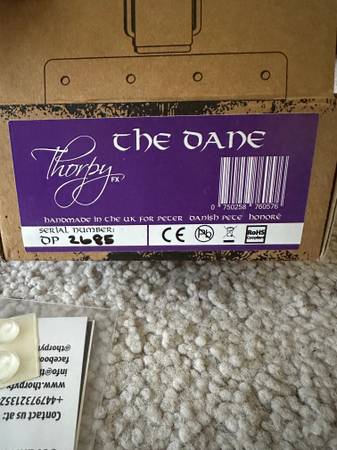Selling my Mint condition ThorpyFX "The Dane" Peter Honore Signature Overdrive and Boost pedal, comes with original box. (Like most pedals these days, they do not come with power cord.) It's built like a tank. Extremely well built. I'm firm on price at $288, so please don't ask for less. thx. Save yourself approx $75 with this lower price and tax. I bought it brand new directly from ThorpyFX from the UK online in Oct. 2022.