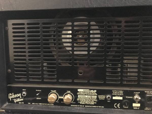 Gibson Goldtone GA-15 15watt 1x10 speaker Volume, Tone knobs and “Bright” switch Non reverb Couple nicks in the tolex but good overall condition. Great grab and go amp.