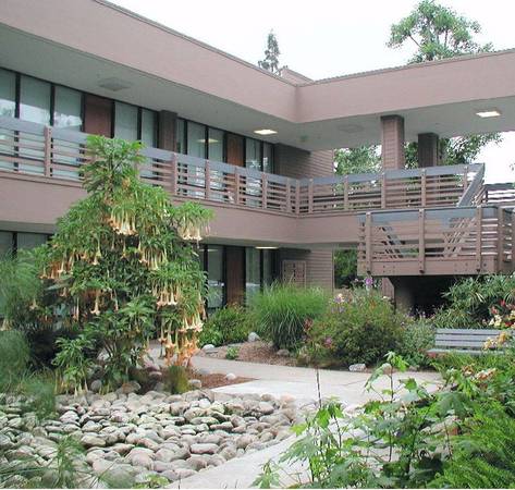 - The building features a bright cheery outdoor courtyard with a water fountain.