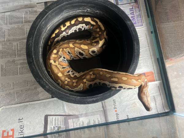 Rehoming my 1 1/2 old female blood python, got her at an expo last year, healthy snake, good colors on her as well as appetite and feeding response. I feed every 3 weeks give or take a week. Has typical blood attitude, not too aggressive but doesn’t like to be bothered or handled. Was gonna raise her up and pair with my brothers male but don’t have space for her anymore. Will include her setup with heat light. $250 obo Also open to trades but only for a chameleon. Panther or Jacksons chameleon( I have a setup ready) or a gargoyle gecko
