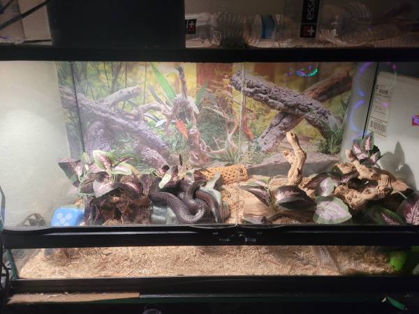 I have a female black Mexican Kingsake named Nyx that is about 5 years old and that I can no longer properly care for and have not been able to handle her often for a while and give her the enrichment she deserves. I'm looking to rehome her for an adoption fee of $300 that will let me know you are serious about this animal's life and wellbeing. If interested, I may be willing to accept an offer to include all the equipment with her as well so her home stays with her, this would include the 40gallon reptile tank, heat lamp, heat mat, thermometer, water dish, feed dish, substrate (just whats in the tank, but recently changed/cleaned in the last week on Nov), and several decor items. Give me an offer for some or all of this equipment and we can negotiate. Depending on when someone reaches out to adopt, I may be able to include frozen feed with Nyx for free as well. Nyx is well mannered and shy, but she WILL find a way to express her feelings! She loves curling up in her water dish and climbing (and knocking down the wood climbs I set up, hopefully you'll have better luck giving her climbs). When she's not hiding away, she's made for the camera, a real photogenic beauty!