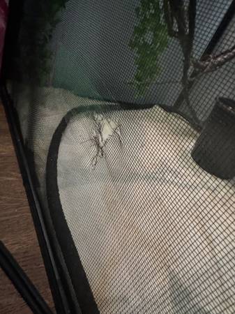 Large screened in enclosure, lighting, water drip container, foliage, (3) vitamins, water spray system and cricket enclosure also available. (Small rip in enclosure - see photo)