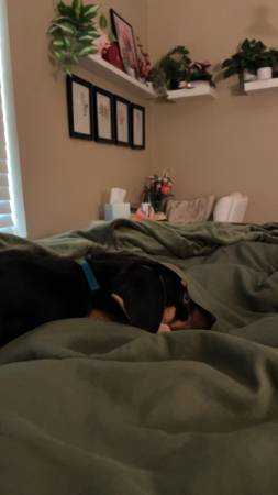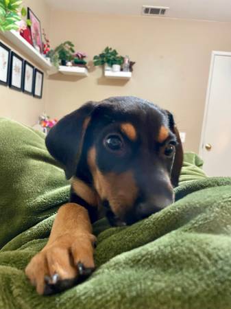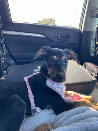 Harlow is 13 weeks old Doberman Pinscher and German Shepard mix. Harlow is spayed and up to date on vaccinations (including rabies shot). She is also microchipped. Harlow knows "sit", "look", "paw", "bathroom", "bed", and her name very well. She is currently being crate trained (her bed is in her crate). She has been taken out on her leash a handful of times and needs to be trained on that. She is in her teething stage. Harlow will do well in a home with a backyard or a living environment that allows her to exercise well for her breed. I think she will do well with other dogs. She loves her squeaky raccoon and fluffy bunny. She loves attention and a good scratch. Harlow has been a calm dog when taken outside to socialize. She loves meeting people and a very big appetite. She also loves her slow feeder when she is fed 3 times a day.