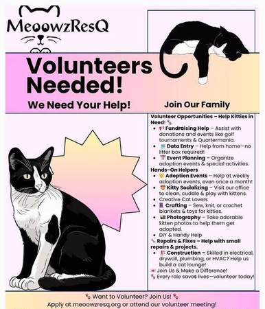 PLEASE VISIT OUR WEBSITE for More Information Including a VOLUNTEER FOSTER APPLICATION by Searching: MeoowzResQ.ORG