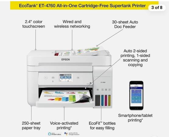 Featuring a robust 250-sheet paper tray and a 30-sheet Auto Document Feeder, this printer is designed to handle large print jobs with ease. The 2.4" color touchscreen ensures easy setup and navigation, while the voice-activated printing feature adds an extra layer of convenience. With both wired and wireless connectivity options, the EcoTank ET-4760 offers flexibility to suit your printing needs.