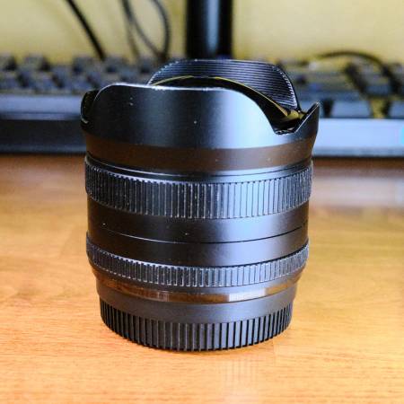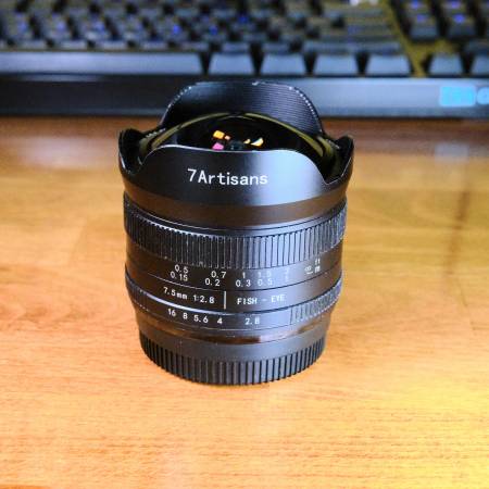 7Artisans 7.5mm f/2.8 fisheye lens Mark II for Fujifilm X-Mount cameras. Manual focus, all-metal build. Produces ultra-wide 180° fisheye images. Aperture range f/2.8 to f/16. Lens shows some cosmetic wear but optics are clear. Rear caps included. Used to take fun photos like the ones included (I had a lot of fun with these lenses but no need anymore.)