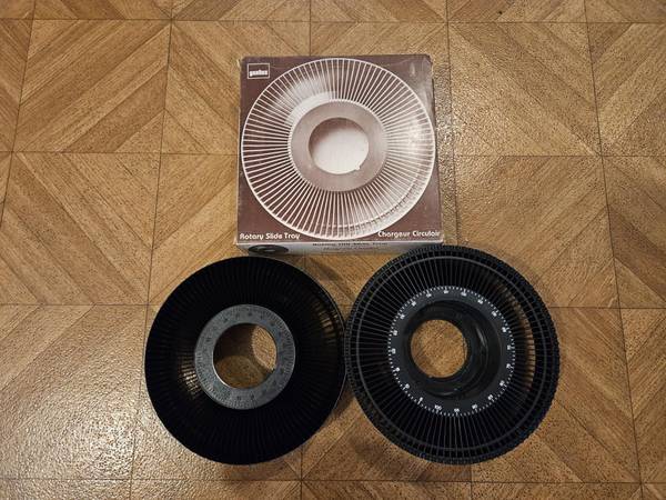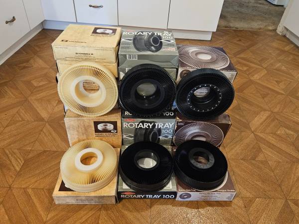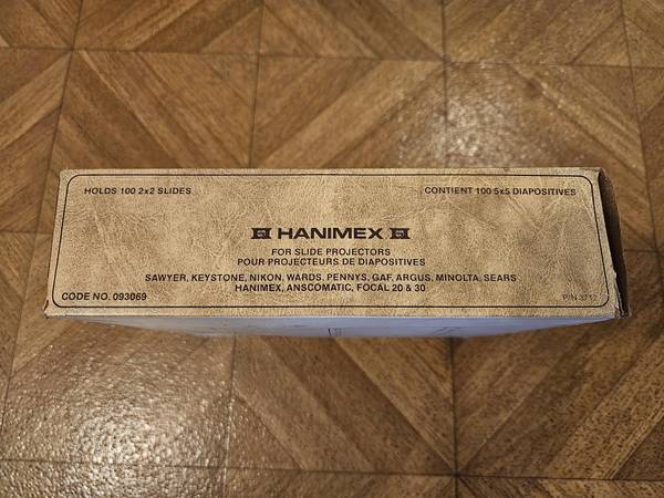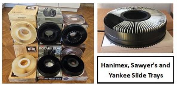 Hanimex box reads: Rotary Slide Tray; Code No. 093069 Sawyer, Keystone, Nikon, Wards, Penny, GAF, Argus, Minolta, Sears, Hanimex, Anscomatic, Focal 20 and 30