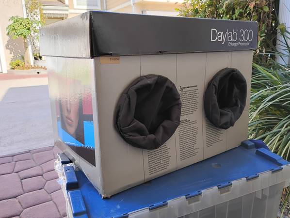 The unique and rare Daylab 300 lets you make color and BW prints anywhere as a tabletop darkroom. Last used 25 years ago to print BW 8x10s before placing in storage. Comes with main unit, power supply, negative holder, original manual and all important sleeved/light-tight darkroom box. Missing the two plastic chemical dispensing bottle but you can fashion some replacement yourself, as I did. A mostly full box of 8x10 BW Polycontrast RC2 is included. You'd need to buy new Developer and Fixer.