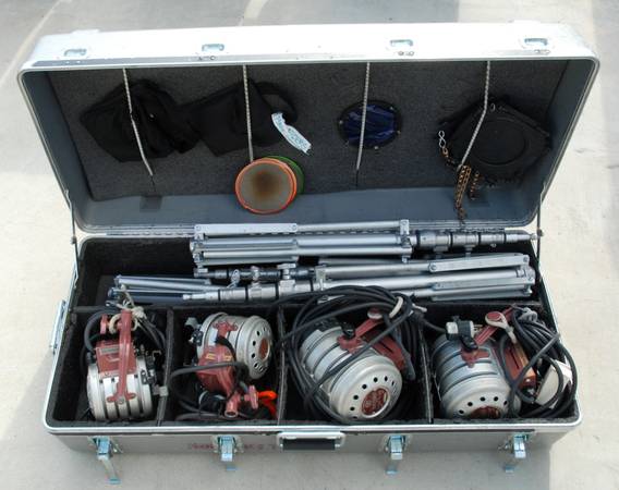 All lights are working, sets of 4 included accessories (Barndoors, Filters) with Hard case. Only one blue film filter as shown.