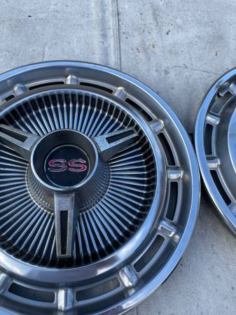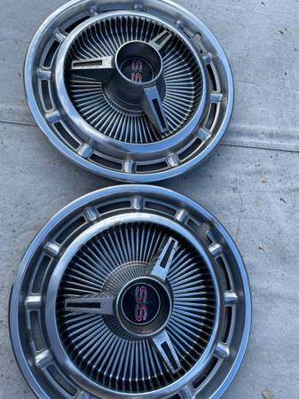 Some cracking in center plastic ss emblem is replaceable 2 hubcaps hub caps See pictures Original OEM hubcaps Impala or? Chevy CALL OR TEXT WITH QUESTIONS NO EMAIL PLEASE THANKS