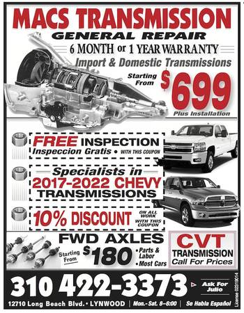 on all makes and models. MAC'S TRANSMISSION, 12710 Long Beach Blvd.