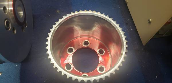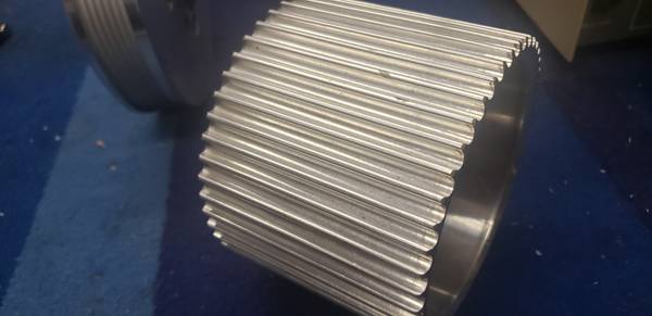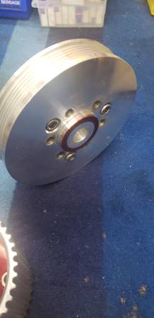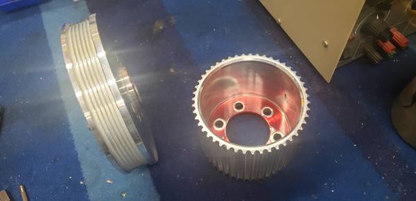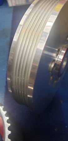 March performance serpentine belt style small block Chevy crank pulley for supercharged use part number 6291 and a 47 tooth , 8mm belt drive supercharger pulley (not sure of the manufacturer on it)...