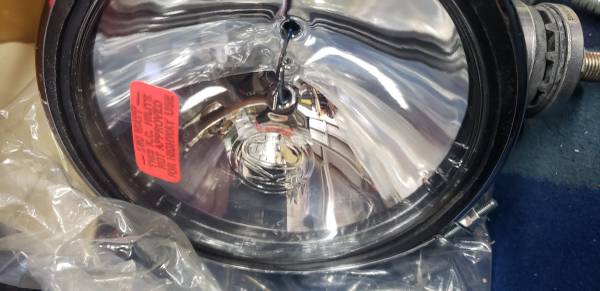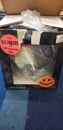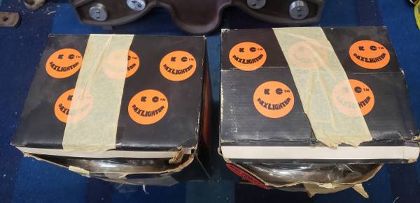 Brand new old stock pair of original round KC Daylighter off road lights. They come in the original (bit worn) boxes and with the original smiley face covers as well.