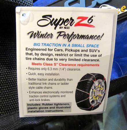 Product Information: Super Z6 has one very special quality; it will operate in less than half the space required by most cable chains and tire chains. To be more precise, it requires only 6.3 mm (1/4″) of operating space in the critical inside sidewall area of the tire (typical Class “S” products require 15mm).