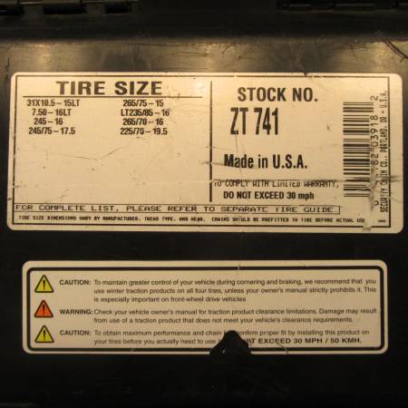 Product Information: SCC SECURTYCHAIN ZT741 Super Z LT Light Truck and SUV Tire Traction Chain. Fastest, easiest installation of any traction product. Built-in rubber tensioner means there is no need to stop and retighten after installation. Better all-around traction performance than conventional tire chains or cables
